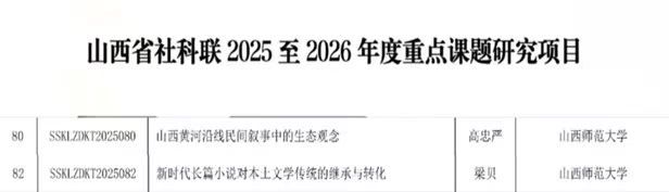 近日,山西省社会科学界联合会公布2025 - 2026年度重点课题立项名单,公司高忠严老师的“山西黄河沿线民间叙事中的生态观念”...