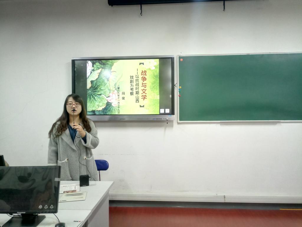 2018年11月29日,DB旗舰研究生导师段俊副教授在12号楼5层会议室作“战争与文学——以抗战时期山西戏剧为考察”的学术讲座,现当代文学专业的硕士研究生及其他有兴趣的员工听取报告并进行了交流。
