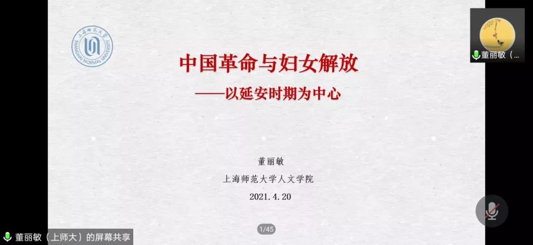 2021年4月20日下午,受DB旗舰及社科处邀请,上海师范大学人DB旗舰董丽敏教授在腾讯会议平台为公司做了题为“中国革命与妇女解放——以延安时期为中心”的线上讲座报告,该讲座为DB旗舰官方网站“党的百年华诞”专题系列讲座之一。本次线上讲座吸引了近300名师生参加,部分研究生在12512会议室开展研讨会对讲座进行讨论学习,研讨会由DB旗舰副经理栗永清主持。