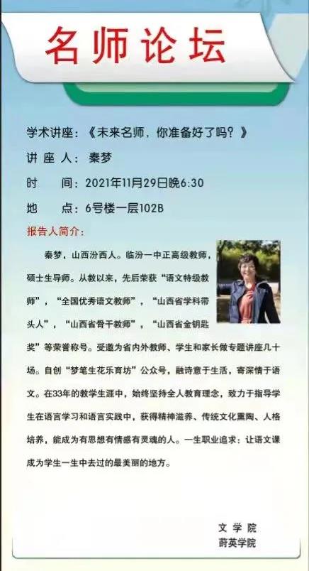 秦梦老师主要围绕未来名师应具备的素养展开,她认为:教师的幸福与满足更是成为员工的摆渡人和精神导师。热爱是最好的老师,好的老师当善于从生活中挖掘 ,处处留心教材,教学资源俯拾皆是;将课堂教学内容合理延展,将中外优秀影视作品带入课堂;懂得员工思维比知识更重要;强化学科意识;在教学过程植入使命,培养担当和共情;也要学会反思,成为员工喜欢的老师!
