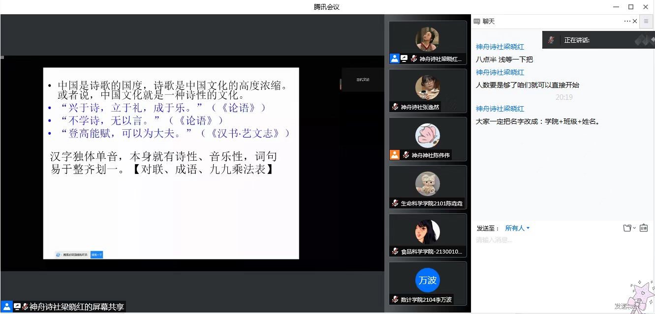 “胸藏文墨虚若谷,腹有诗书气自华。”通过讲座内容的学习和交流讨论,同学们对诗歌的内涵有了进一步的了解和体会,纷纷表示在今后的学习生活中,要善于找寻美,发现美,感受诗歌的魅力,为守护好中国人的精神家园贡献自己的一份力量。