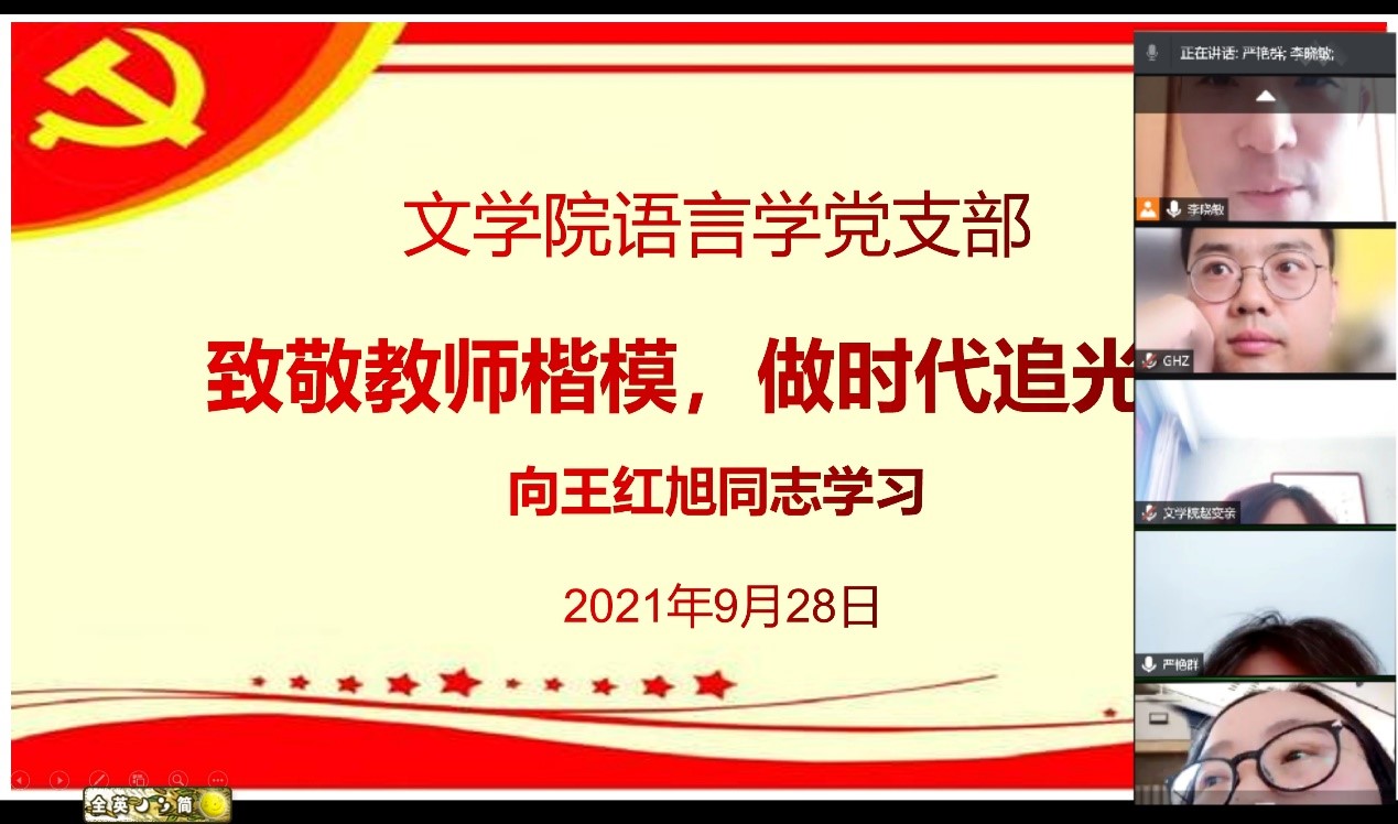 9月28日,DB旗舰语言学党支部书记李晓敏组织支部全体党员集体学习王红旭同志的先进事迹。