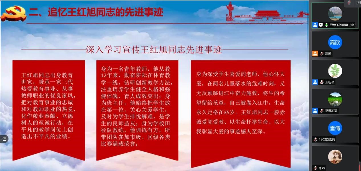 王红旭同志因救两名不慎掉入江水的男童,不幸被江水冲走,年仅35岁,他胸怀大爱、见义勇为,用短暂一生,诠释了为人师表、行为世范的深刻意义。王红旭同志是践行“四有”好老师要求的先锋模范,是教育系统庆祝中国共产党百年华诞,在青年教师中学党史、干实事涌现出的杰出代表。以王红旭同志为榜样,向王红旭同志学习,对广大教育工作者和党员同志具有深远意义。
