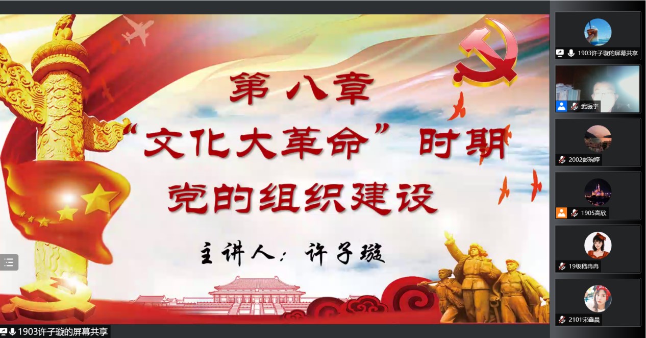 许子璇同志讲述了《中国共产党组织建设一百年》第八章“文化大革命”时期党的组织建设的内容,带领全体同志回顾了文化大革命的背景、影响。她重点讲述了文革期间全面整顿中的党的组织整顿,概述了粉碎“四人帮”等重大历史事件,提出作为预备党员要不忘初心,方得始终。