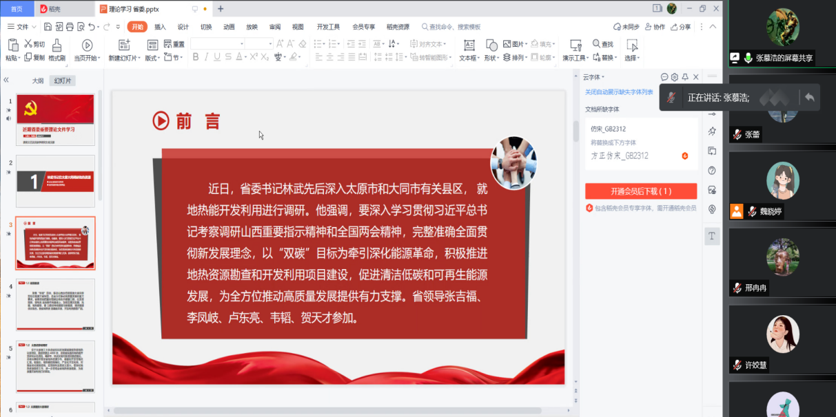 学习会上,魏晓婷带领全体党员同志共同学习了《在中央政协工作会议暨庆祝中国人民政治协商会议成立70周年大会上的讲话》,使大家对中国人民政协在新时代下的重大作用和独特优势有了全新的认识与了解。张慕浩分享了近期省委的重要指示精神:林武书记在太原和大同调研地热资源,强调以“双碳”目标为牵引深化能源革命,积极推进地热资源勘查和开发利用项目建设;全省抓党建促基层治理能力提升动员暨培训会议的召开等内容,引导党员同志积极学习省委相关工作部署,秉持实干精神,全面落实中央及省委的相关政策与要求。