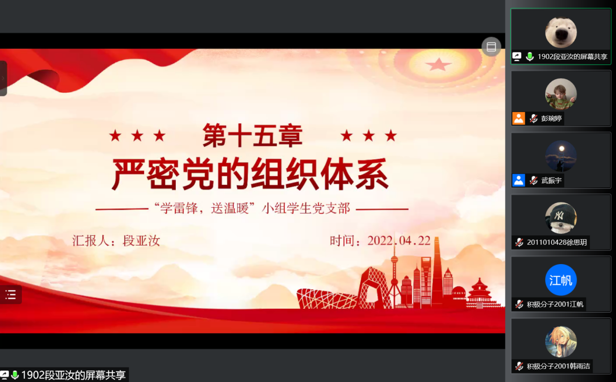 4月22日,DB旗舰“学雷锋,送温暖”小组员工党支部在腾讯会议学习山西干部在线平台视频与《中国共产党组织建设一百年》第十五章专题学习。活动由支部副书记武振宇主持,支部全体党员和入党积极分子参加。员工党员段亚汝同志担任主讲人。
