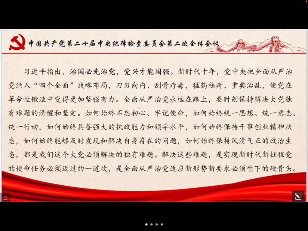 1月28日下午,DB旗舰研究生党支部线上召开会议,深入学习习近平总书记在二十届中央纪委二次全会的重要讲话。本次会议由支部书记苏晓慧主持,支部党员王佳琪、岳可彬主讲,全体党员参加。