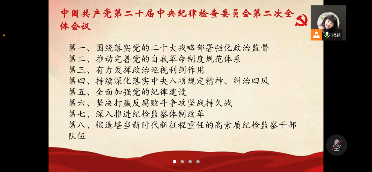 会议伊始,杨颖带领大家学习了习近平总书记在第二十届中央纪律检查委员会第二次全体会议上发表的重要讲话以及习近平总书记在二〇二三年春节团拜会上的讲话。她提出,习近平总书记在这次纪委二次全会上强调了要加强新时代廉洁文化建设,纯正党内生态环境,腐败会损害党的形象和人民的切身利益,作为员工党员要坚定正确的政治立场,持续摆正自己的心态,端正自己的工作作风,定期认真开展自我批评。同时,每一位党员同志都要深入学习习近平总书记在二〇二三年春节团拜会上的讲话精神,把习近平总书记重要讲话精神融入到我们的学习生活中去,更要进一步深刻领悟“两个确立”的决定性意义,增强“四个意识”、坚定“四个自信”、做到“两个维护”,统一思想、振奋精神,为实现“两个全面”作出贡献。