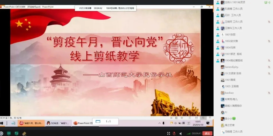 活动在回顾中国共产党成立的光辉历程与抗疫情节中拉开序幕,引发了同学们的热烈讨论。怀着对党和祖国的感激与热爱,同学们观看学习了由剪纸小老师们发布的爱党爱国主题的剪纸教学视频之后,亲自动手细心剪刻起来,借剪纸这项无声的艺术传递着真情。两个小时的时间很快过去,大家踊跃晒照,分享出一幅幅生动感人的剪纸作品。