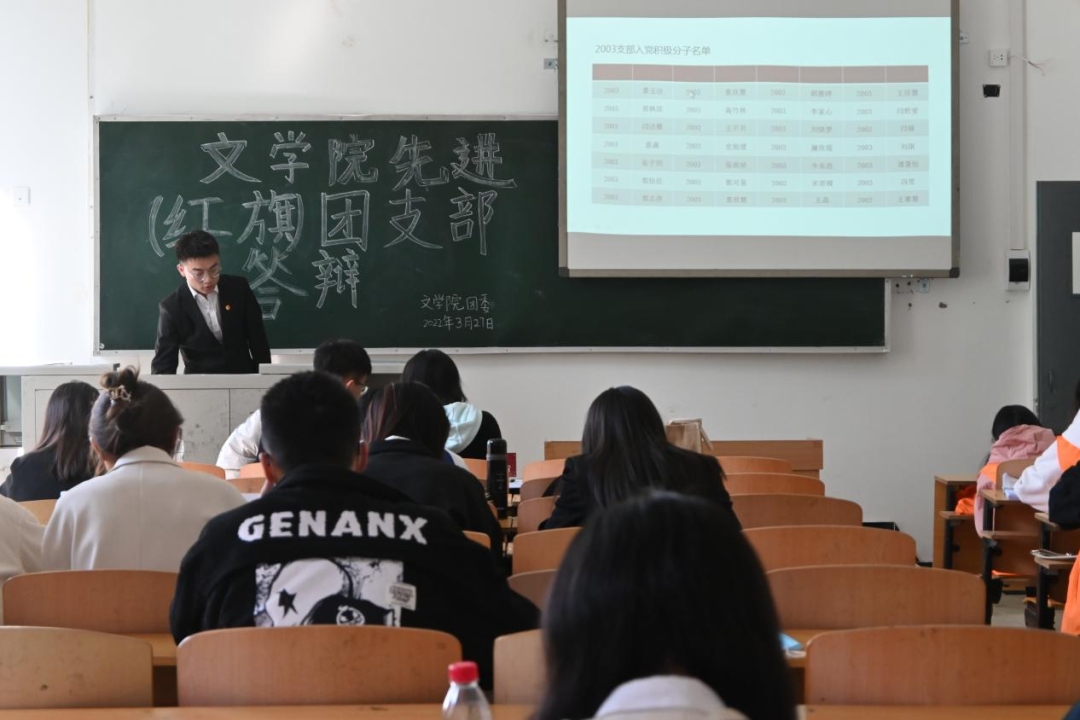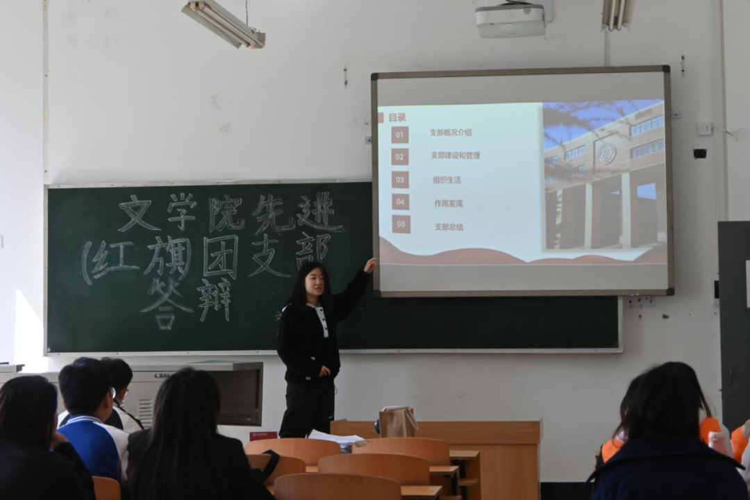 各班团支书采用“PPT演示+现场汇报”的方式,立足自身特色,围绕团支部概况、支部建设、支部荣誉、特色活动和作用发挥五方面对本团支部工作成果进行展示,并围绕团员管理和团支部党史学习教育进行重点阐述,对未来工作提出了细致规划和改进措施。