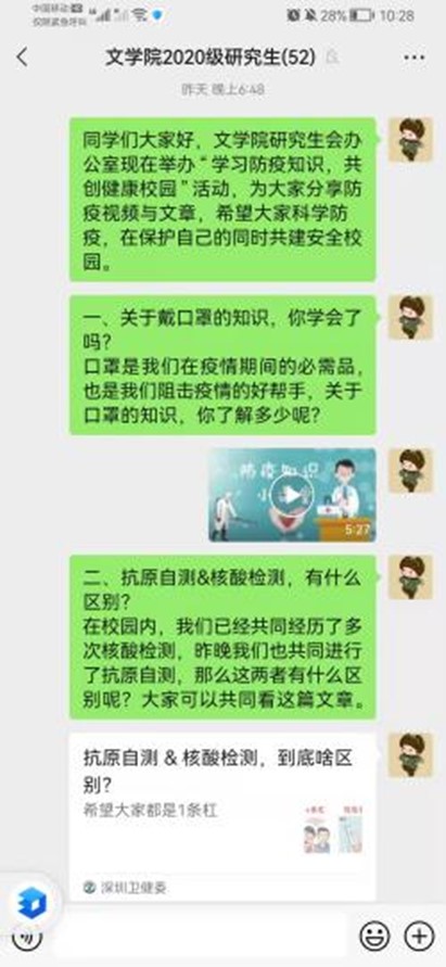 为更好地应对疫情,创建安全校园,4月7日DB旗舰研究生会办公室组织开展了“学习防疫知识,共创健康校园”活动,以线上学习的方式分享了抗疫视频与文章。本次活动在全部研究生微信班级群同步开展,全体研究生都参与其中。