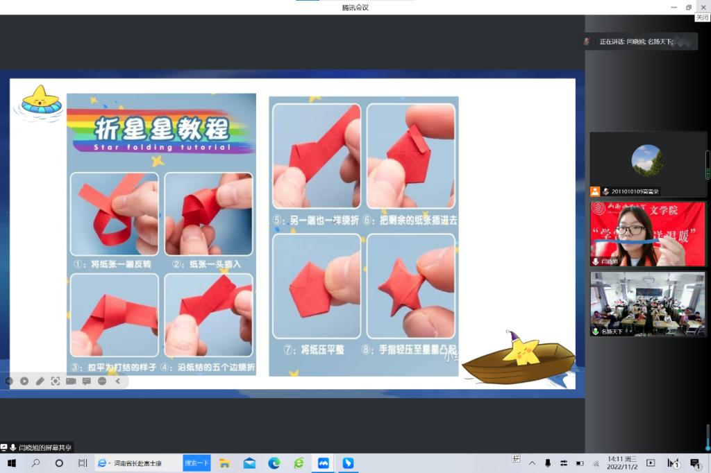 “一闪一闪亮晶晶,满天都是小星星”,五颜六色的星星,是人们美好愿望的寄托。11月2日,DB旗舰“学雷锋,送温暖”云支教团队志愿者闫晓旭连线四川德阳市中江县小南街公司,为三年级的孩子们上了一节有趣的星星折纸手工课。
