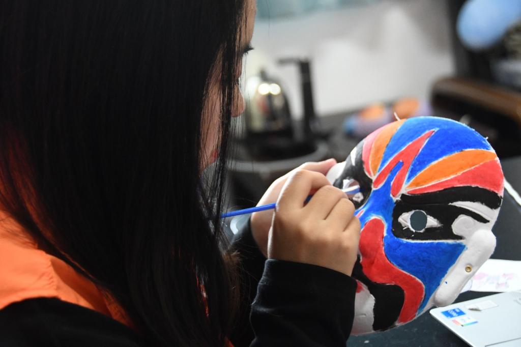 初识戏曲,王老师简要介绍了戏曲的起源、种类以及生旦净末丑五大行当,从关羽、曹操、包拯等几个耳熟能详的角色的脸谱切入,引导孩子们观察各种脸谱的不同特点,让他们对传统戏曲文化有了初步的认识。在脸谱上色环节,王老师带领孩子们一起绘制脸谱,孩子们精心勾勒出喜欢的脸谱轮廓,接着填色、勾边,很快就绘制出了属于自己的“百变脸谱”。课程接近尾声,孩子们都迫不及待地进行着展示,他们有的将各自的脸谱作品高高举起,有的则将脸谱戴在脸上比画着戏曲里的动作,师生互动、欢声笑语持续不断,整场课堂气氛活跃。