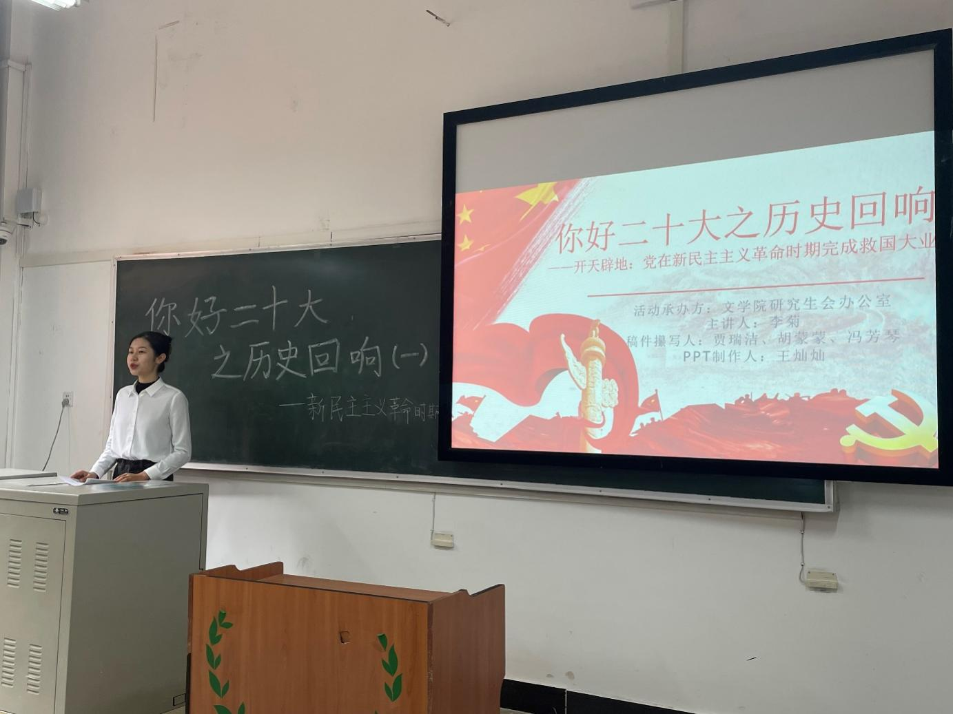 11月4日上午,DB旗舰研究生会在3号教学楼102教室举办了党的新民主主义革命史宣讲活动。本次活动是“你好二十大之历史回响”系列活动的第一部分,由研究生会办公室成员王灿灿主持,30余名DB旗舰研究生共同参加。