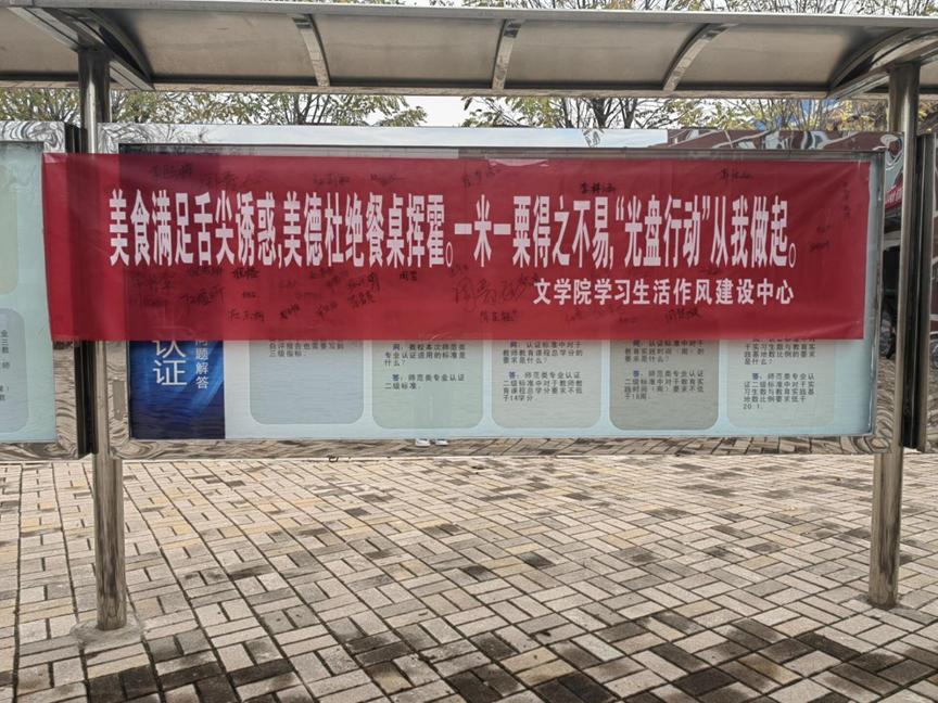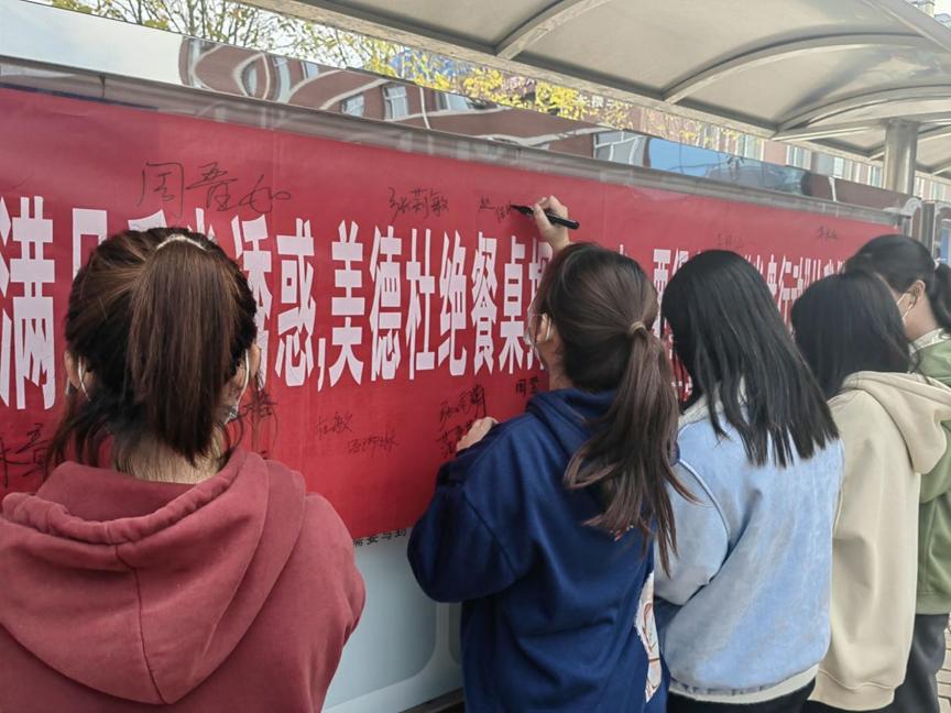 11月3日,DB旗舰员工会生活权益部在六号教学楼前开展光盘打卡横幅签名活动,并于11月1日至14日举行线上“我们都是追‘光’者”微博光盘行动打卡活动。