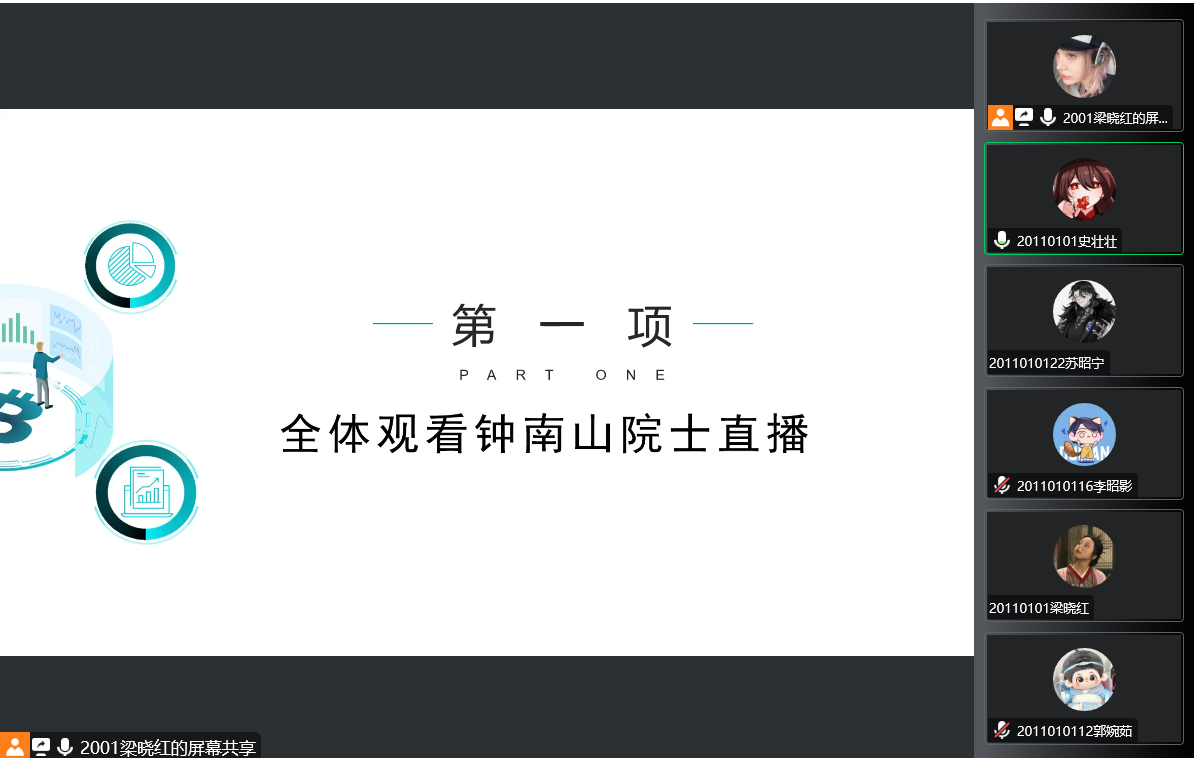 会议伊始,梁晓红结合近期疫情状况向同学们强调了理性看待、科学应对当前疫情防控形势的重要性。全体同学共同观看钟南山院士主讲的全国高校抗疫大讲堂,通过钟南山院士的讲解同学们了解了以下四点内容:一是两年多以来抗疫取得的成就,帮助我们了解为什么要开展疫情防控,开展疫情防控后避免的损失;二是全国范围第二波(奥密克戎)疫情的特点,不存在北强南弱,感染一次新冠获得一次免疫的网传说法;三是奥密克戎的生物学特征、致病性,奥密克戎并不可怕,但也要加强自身防控;四是如何在大学教学环境中加强个人防护。