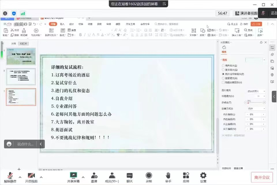 赵连国研究生考入兰州大学DB旗舰汉语国际教育专业,现兼任兰州大学2020级的辅导员老师。会上,赵连国以“呈现‘真实+真诚’的你”为主题,结合自身经历,从积极的心理暗示、专业课知识复习及详细的复试流程等方面,就考研复试的相关经验进行分享。同时,针对不同年级的备考情况,他还提出多条具体建议。他谈到,一、二年级的同学们应关注衣着打扮与谈吐方面的内容,而三、四年级的同学们则更应关注整个复试的细节性问题。