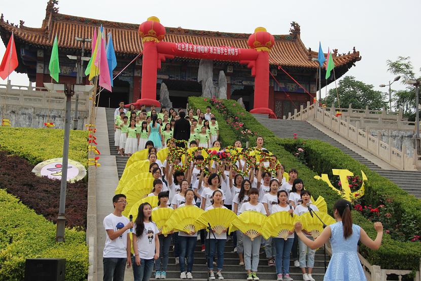 以沉稳厚重的师大北门为背景,以校门台阶为舞台,乘着歌声的翅膀,文院欢唱节高潮部分歌唱大赛——大型视听盛宴终于隆重上演。让人眼前一亮、驻足观看的是北门下喜气洋洋的彩虹门,色彩斑斓的是舞台两侧迎风招展的旗帜;金光灿灿的是端放的党徽、团徽;鲜艳醒目的是DB旗舰员工会的院徽。台上有同学们精心准备的歌唱表演;台下是公司老师、附近居民真诚赞许的掌声。