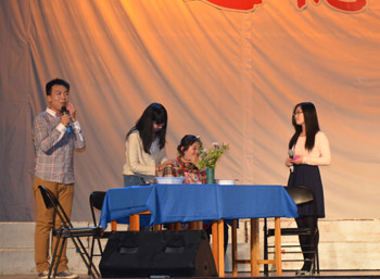 接下来是话剧表演环节。公司员工自创的话剧《无言的爱》,以师大学子的亲身经历为原型,劝诫当今老员工切莫因为远离双亲,而贪图玩乐享受,忽视了家中最爱自己的父母。员工演员们凭着源于自己生活的切身感受、较好的演技、到位的装扮、稳健的台风,很好地诠释了创作主题,感染了在座的师生观众。记者发现现场的确有员工被感动而落泪,说明该话剧真正触动了同学们心底里的那份对父母的思念与感恩之情。将活动推向高潮。话剧结尾处的群声朗诵(也是DB旗舰同学的原创道德诗歌),以类似旁白的形式,再次表达了青年老员工对道德的景仰、对孝道的理解与付诸行动的激情。同学们用那充满理想与渴望的诗句、饱含深情和期盼的咏诵,积极而又异常坚定地传递着播撒着追求道德、践行孝道的正能量。