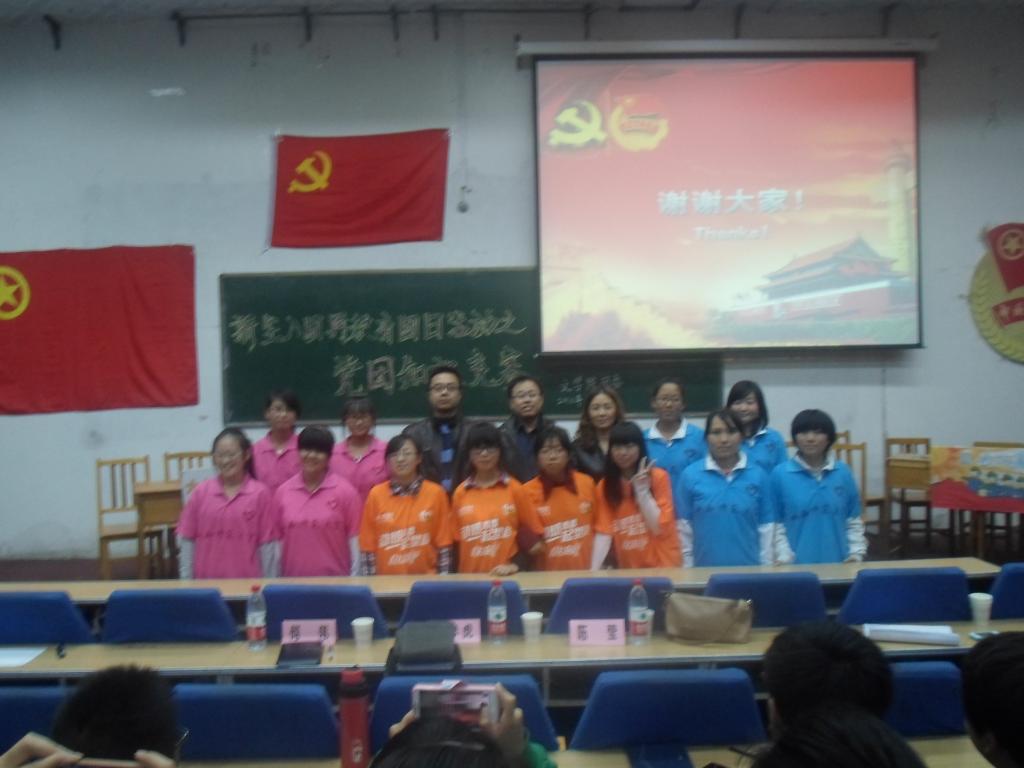 2013年11月1日晚,公司团委在05203教室举办了入团再教育决赛暨党团知识竞赛,DB旗舰党委委员、团委书记孙学虎及各班辅导员出席。活动现场所有成员高唱共青团团歌,重温入团誓词,观看了前期各班团日活动的精选视频。在竞赛环节,红、黄、蓝三个参赛队的同学巧妙应答,展示了公司学子的博学多才与青春朝气,表现了他们对党团知识的熟练掌握程度。接下来的腾讯微博互动抽奖及歌曲演唱环节极大地活跃了现场的气氛,由1302班与1303班团支部代表组成的蓝色风暴队一路领先,极具优势,最终摘得桂冠。