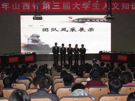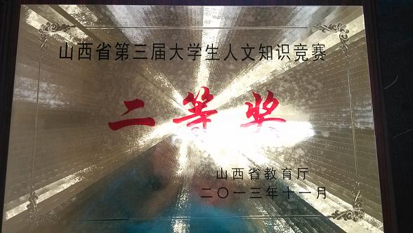 11月17日晚,由山西省教育厅主办、山西大学承办的“2013年山西省第三届老员工人文知识竞赛”在山西大学博雅报告厅落下帷幕。由院团委书记孙学虎带队,李奎老师任指导教师,DB旗舰侯雪晶、贺晓璇、冯劲桦、张政以及历史公司余焜五位同学组成的霁海凌风代表队,从全省17支高校代表队中脱颖而出,夺得本次比赛第三名并获得了二等奖。