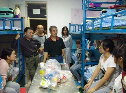 由党委书记吴华英老师带领的一组走访了二层男生宿舍以及四层女生宿舍。每到一个宿舍后,吴书记一行都要与新生进行简单的自我介绍。之后,吴华英老师嘱咐她们在校一定注意人身安全、用电安全,保管好个人财物,并谨防因校外人员进宿舍推销而上当受骗。叮嘱同学们要尽快克服想家的情绪,结交新朋友,舍友之间要彼此理解,彼此宽容。吴老师的一句“我就是你们大学四年生活上的妈妈”,为刚刚踏进大公司园的员工们送去了浓浓的爱意与关切。强老师更是亲自检查宿舍门窗,示范安全的关闭门窗方法,再次强调同学们住宿以及离开宿舍时的安全。同时,各班辅导员也抓紧时间熟悉本班的同学,并仔细叮嘱大家要尽快熟悉校园环境,融入师大良好的学习氛围中。无障碍的亲切交谈,让师生间的第一次见面变得亲切而温馨。