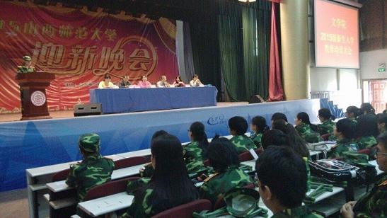 在场全体师生同声高唱国歌后,大会正式开始。在校生代表、院员工会主席冯劲桦同学首先以学长的身份为新生送去了文院人一脉相承的关心和爱。他希望学弟学妹们都能以一颗安然宽纳的心面对未来的老员工活,并珍惜这自己用大把青春换来的梦想舞台。他将学习与社交比作农业与商业,决不可偏废,并建议同学们做好自己的选择,既能自食其力,又可迅速长成。随后,新生代表彭琪同学也谈到了自己初入师大的感受,并且呼吁同学们学会乐观、学会适应、学会接受、学会感恩。