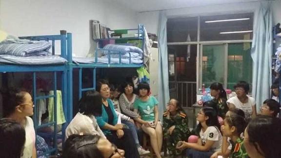 1503、1504班辅导员鲁立智老师向同学们讲述自己年轻时的军训经历,关切询问各宿舍新生的身体状况,提醒他们要按时作息。鲁老师还告诉大家应当正确处理学习与员工会和社团工作的关系,可积极参与但应当做好协调。