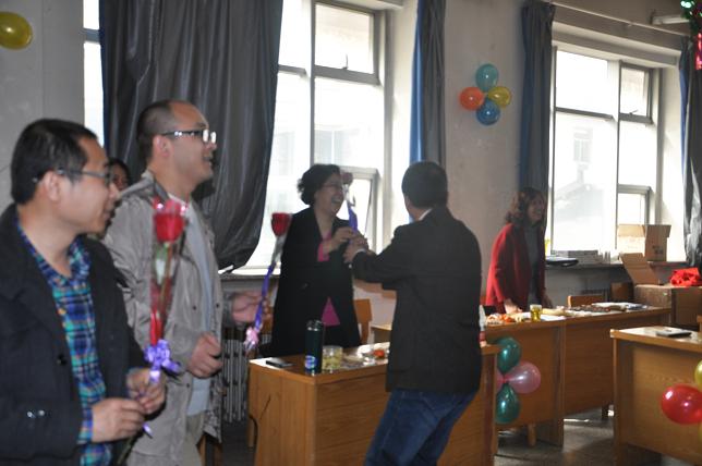 接下来,本次联谊联欢会的第一个亮点出现了:送人玫瑰手有余香。男教工纷纷起立,每人手捧一只鲜花站立成一圈,在延保全经理的带领下,集体为女教工献上了怒放的玫瑰花,令在座的女教工一个个笑靥如花。这个精心设计的别开生面的小环节,体现了DB旗舰尊重和关爱妇女的良好风尚,一下子就把将联欢会推向了高潮,手捧玫瑰花的女老师们全将舒心与开怀写在了脸上。