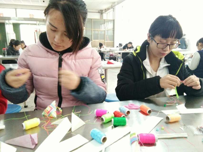 民俗学社香囊组以做缠绕式香囊为主,凸显色彩的绚丽,再加上彩珠的装饰,散发中药花卉的香气,承载着大家对爱情友情的美好祝愿。因为对如此精致的艺术品的期待,同学们的参与热情比以往更高涨。学习现场,香囊组的老师首先教大家如何打结,然后,将各种颜色的线截取一段长度后再次打结,最后,把它们缠绕到一个纸棒上,做香囊的线就都准备好了,接下来,开始一圈一圈缠绕香囊。从折纸成型到配线缠线再到串珠结穗,每一步都要精心挑选搭配,每一个步骤都需要同学们小心翼翼的完成。虽然面临线头翻飞、珠子颜色不协调、穗的颜色杂乱等问题,但是,大家都丝毫没有懈怠,一丝不苟地完成了手中的制作任务。“我很享受用心在做一件事情的感觉。”不少前来学习的同学如是说。