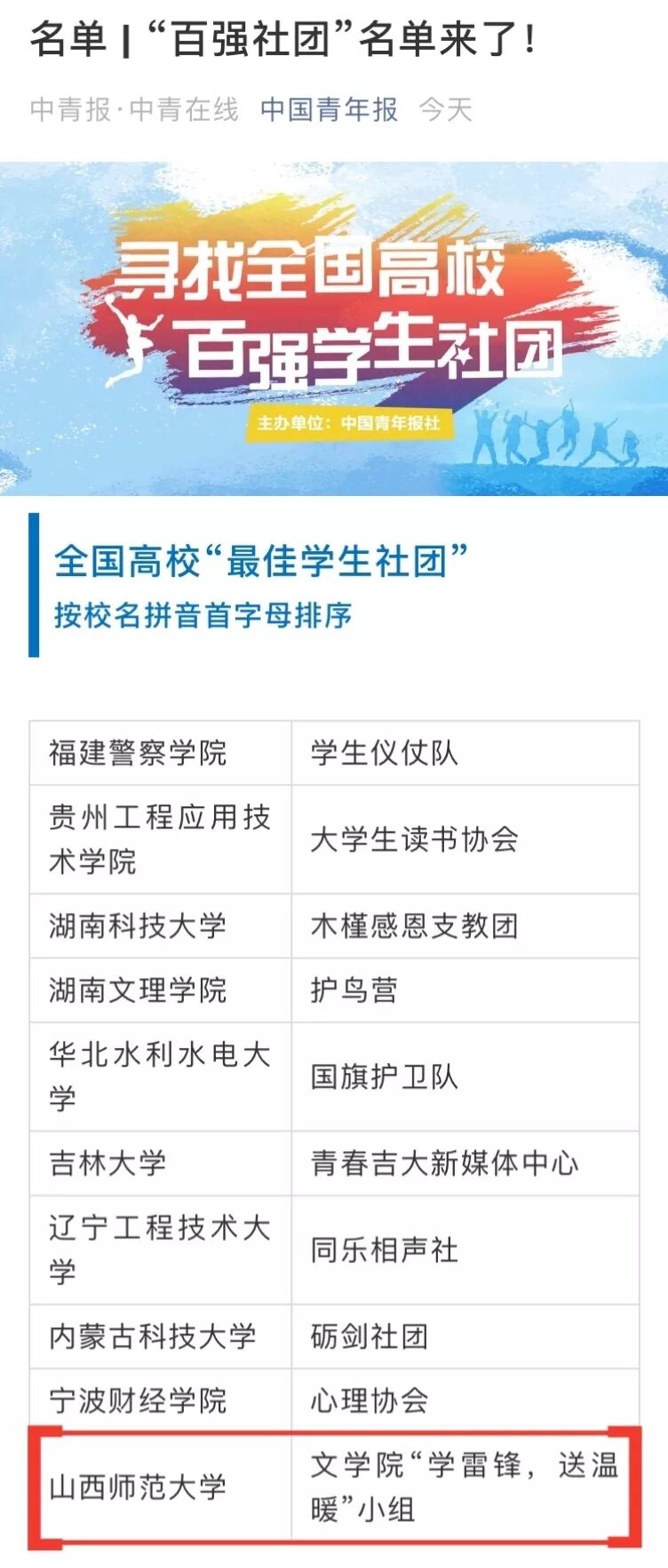 日前,由中国青年报社主办的寻找“全国高校百强员工社团”活动落下帷幕,经过高校推荐、社团自荐、社团展示、网络投票、技术筛查、专家评审等环节后,公司“学雷锋,送温暖”小组入选全国高校“最佳员工社团”十强。