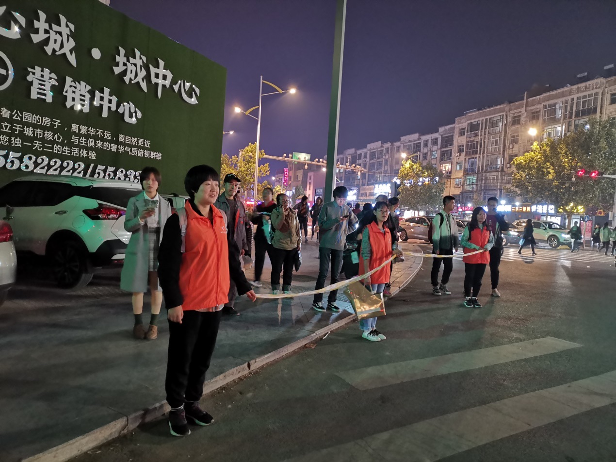 活动中,小组成员分别站于来往华盛小区和新松小区的红绿灯十字路口处,使用小红旗指示、手势引导等方式指挥行人,从而规范来往员工及市民横穿马路的行为。