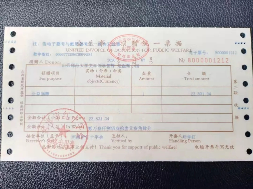 十元、二十元、五十元、一百元……募捐通知一经发出便受到了同学们的积极响应,截至2月4日,在820余名同学的踊跃参加下活动首批筹集的捐款数额达23831.34元,小组将文院学子的点滴爱心汇聚成河,并第一时间捐助给公司战略合作城市运城市河津市红十字会,为这场全民战“疫”献微小爱心、尽微薄之力。