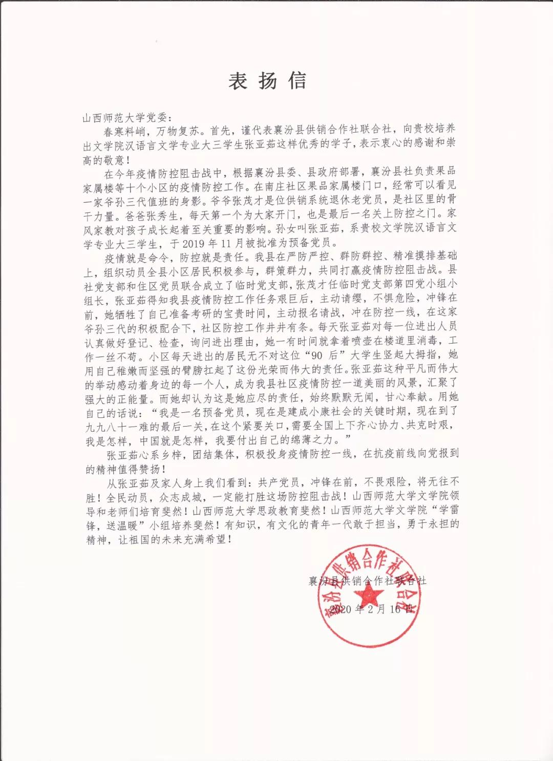 张亚茹从就小受到了良好的家庭影响。她的祖父是一名退休老党员,是社区工作的骨干,还担任了疫情防控期间临时党支部第四党小组组长;父亲每天坚持第一个为大家打开小区大门,也是最后一个关上防控之门。他们祖孙三代上阵防疫的事迹感动了身边的每一位居民和社区防疫责任单位的工作人员,襄汾县人民政府网站以《有多大担当,才能干多大事业》为题报道了他们的事迹,县供销合作社联合社特地向公司发来了表扬信。