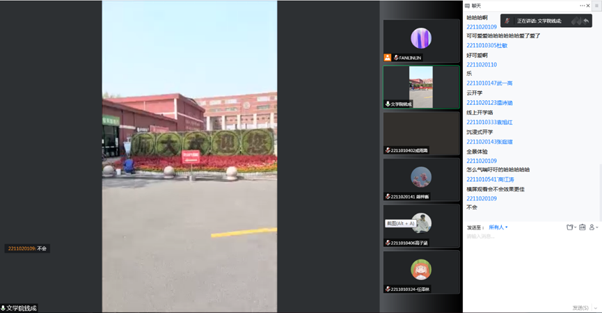 主题教育环节结束后,为让大家可以更好地熟悉校园环境,钱书记亲自带领22级新生进行线上云游校园,22级新生跟随视频镜头,参观师大的一草一木。从DB旗舰办公室出发,沿师大中轴线观光,他分别为大家介绍了图书馆、思政文化街、餐厅、毓秀湖及主要教学楼等校园地点,大家狂刷弹幕:“书记好可爱”“沉浸式开学”“老师慢点走”“公司是不是有郁金香”“想看猫学长”“这个湖里是不是可以钓鱼”……在整个直播的过程中,发问不断,解疑不止,气氛活跃。