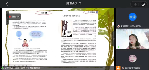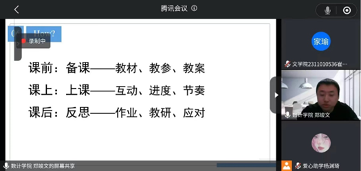 党子妍从文科生的角度对爱心助学活动进行讲解,以“三个抓手”为基本来强调备好一堂课是上好一堂课的前提。首先是“抓好员工”,要做到心中有员工,课前做好沟通,了解员工需求;其次要“抓好教材”,深入研读教材,掌握课时目标并注重单元导读和专题梳理;最后要“抓好教法”,因时制宜地采用不同教学方法,适应线上教学。