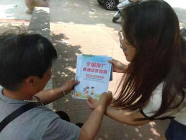 “益启说”推普志愿者向当地居民发放宣传页 “益启说”推普志愿者进行问卷调查